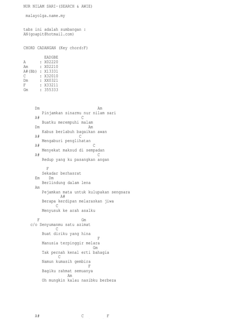 Intro F Am Bb C Bb Dm Eb F Dm Dm Am Pinjam sinarmu Nur Nilam Sari Bb C Buatku merempuhi malam Dm Am Kabus berlabuh bagaikan awan Bb C Mengaburi penglihatan Gm C Menyekat maksud di sempadan Gm C Redup yang ku pasangkan angan F Sekadar berhasrat Dm Berlindung dalam lena Am Pejamkan mata untuk ku lupakan. TIPS PENCARIAN LIRIK FAVORIT ANDA. Nasir dipetik dari laman Facebook M.